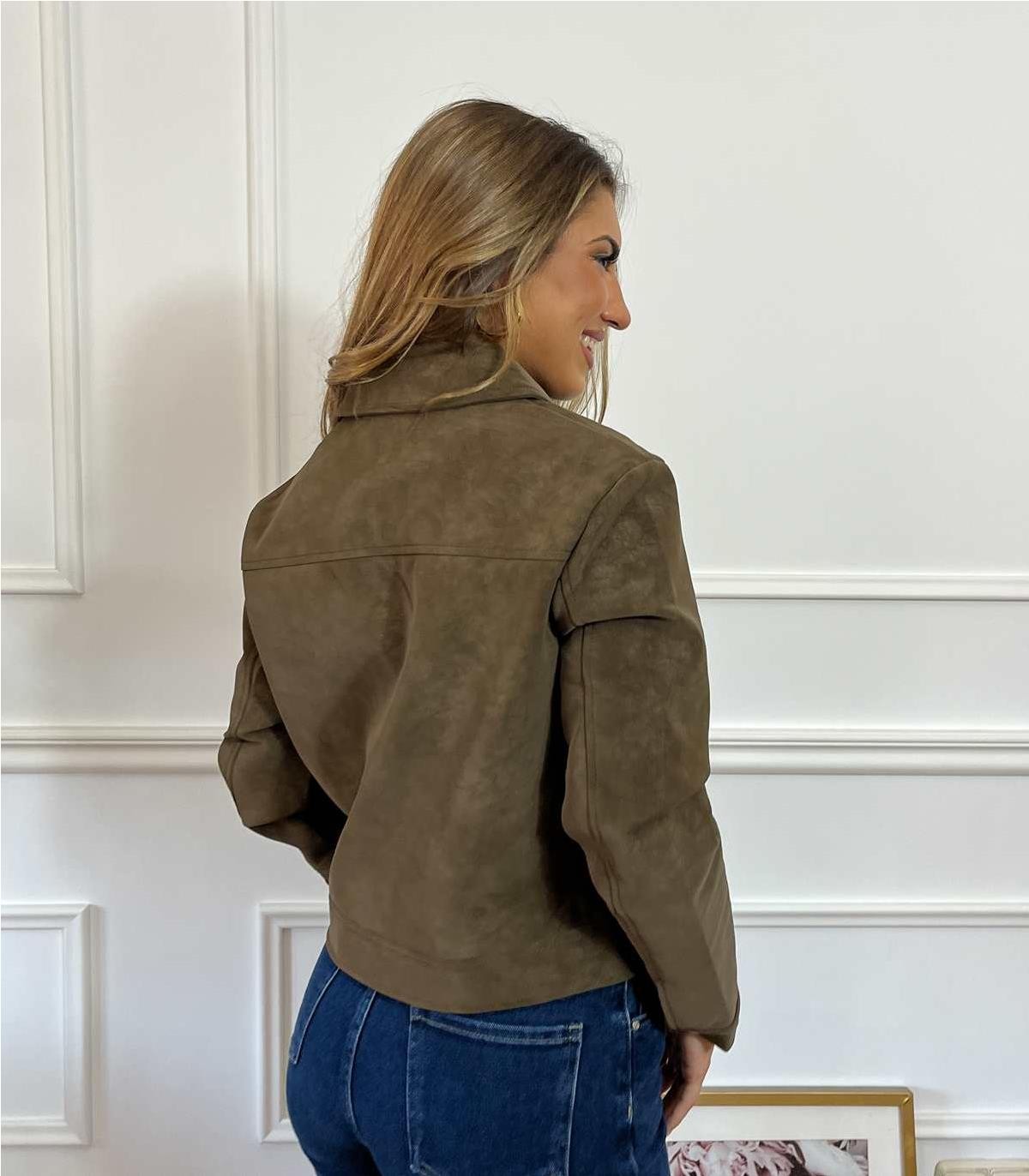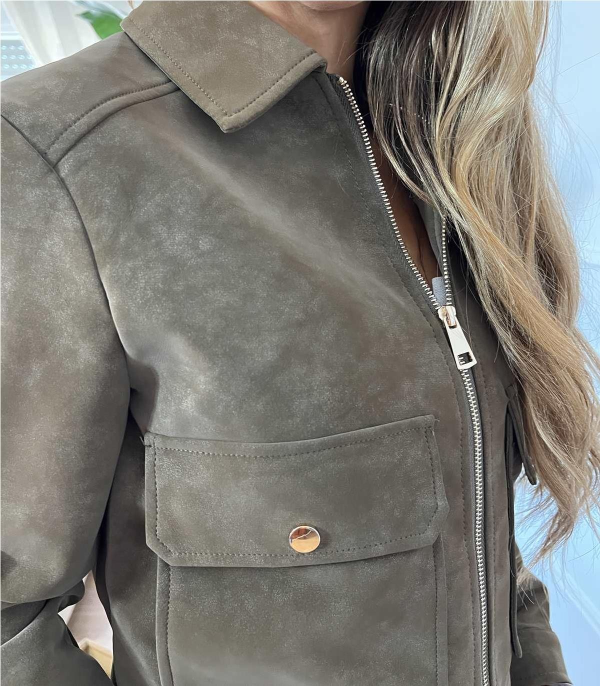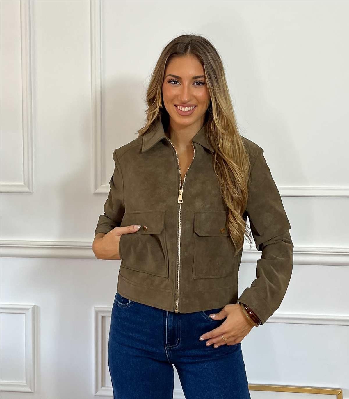 Cazadora oversize antelina con bolsillos blaston y cremallera, Gisela lleva talla S