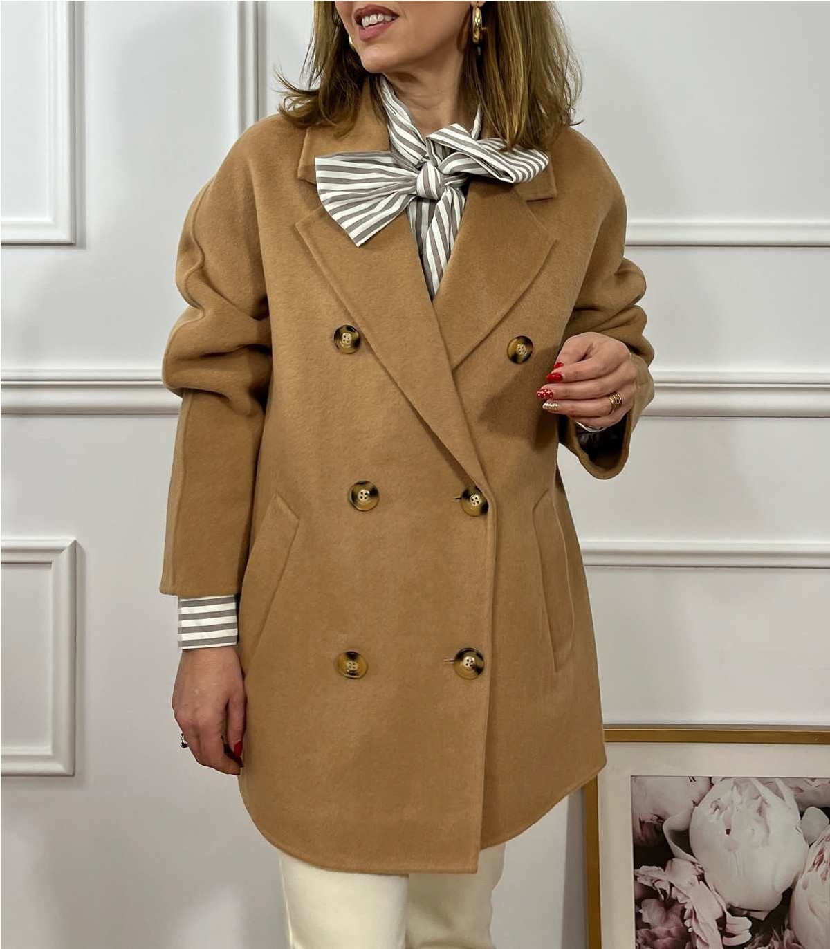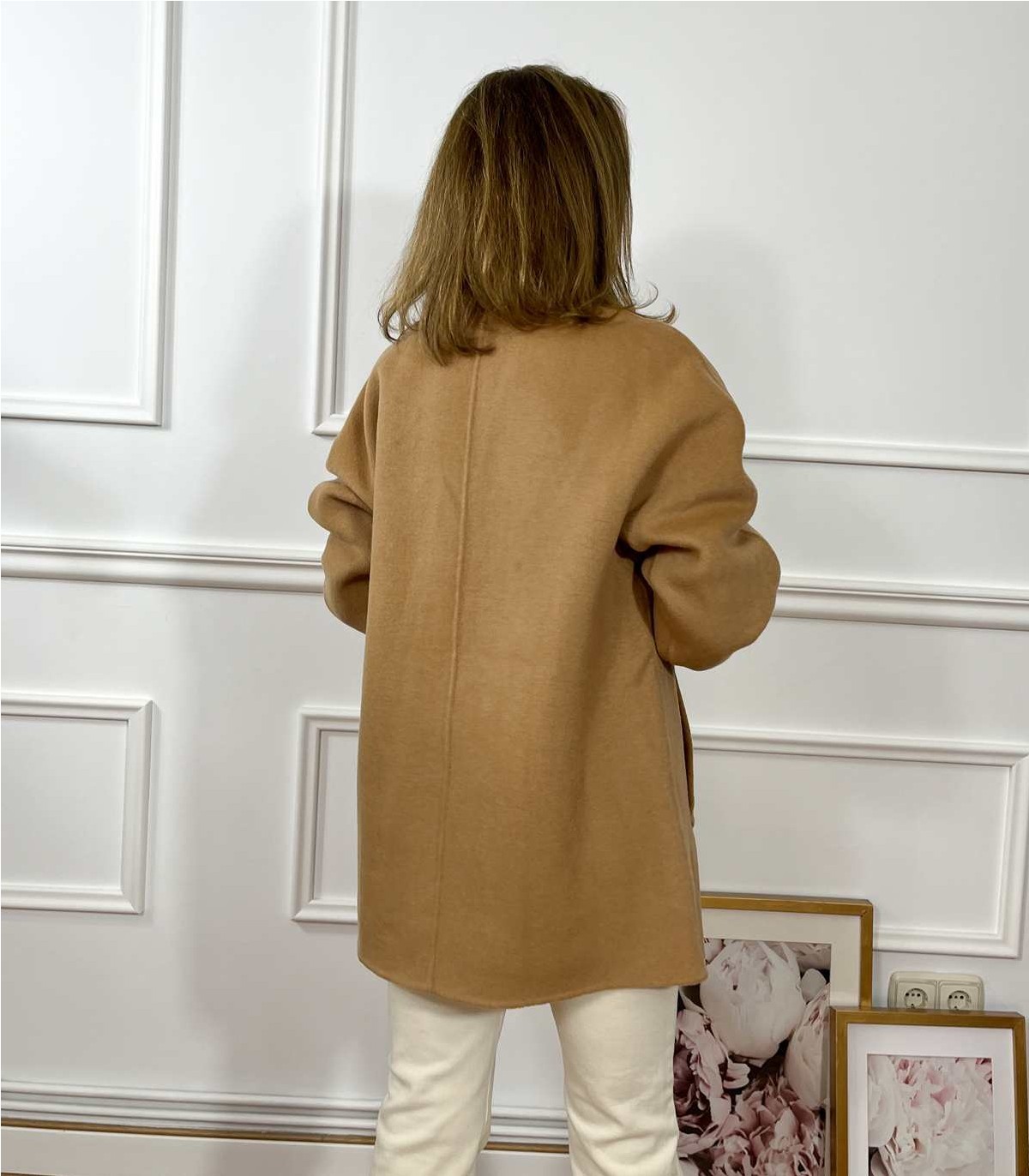 Abrigo corto con bolsillos ,no lleva forro ,tejido con pelillo muy suave y con lana ,Estrella lleva una SM .