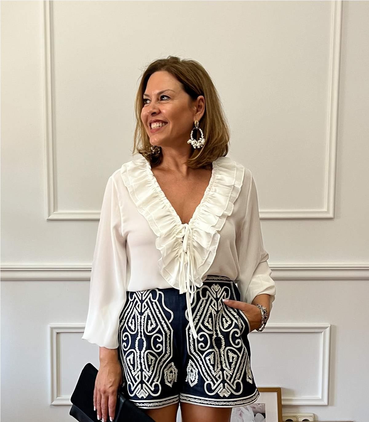 Blusa efecto seda, con volante en el cuello y atada. Estrella lleva Talla S
