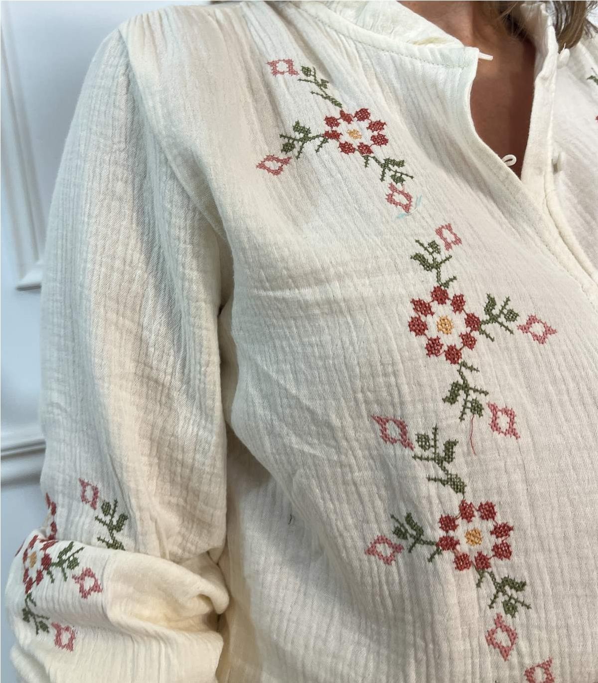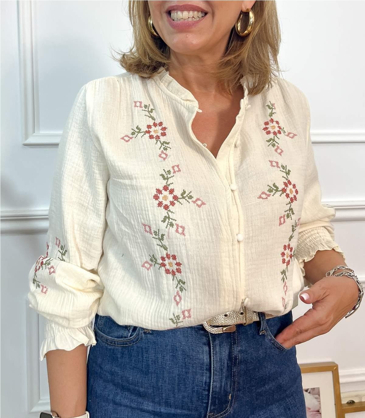 Camisa bordada en punto de cruz, puño emgomado, botones forrados. Estrella lleva Talla M
