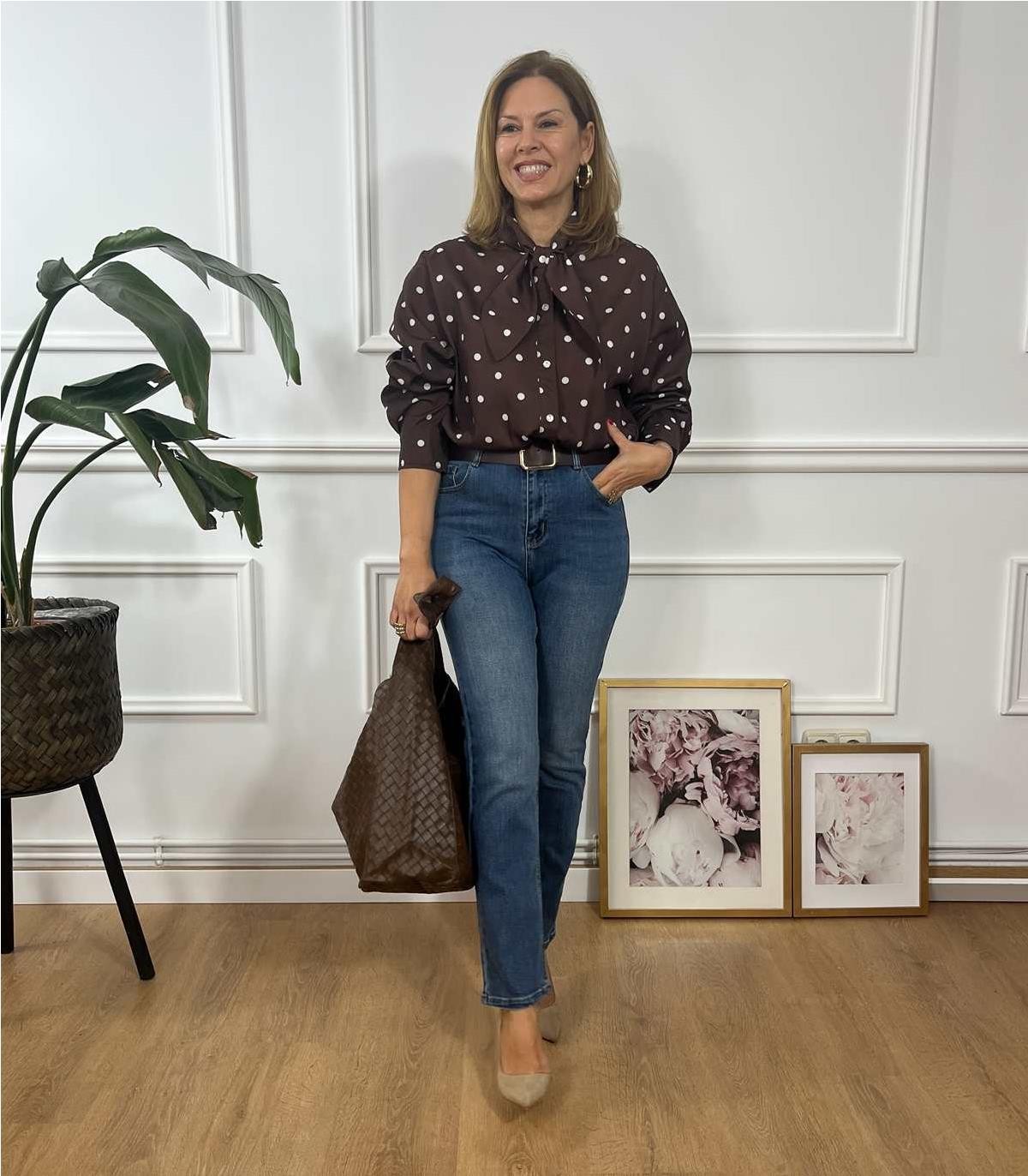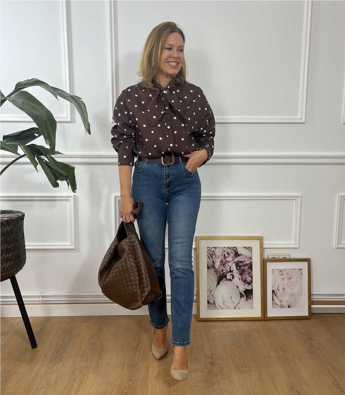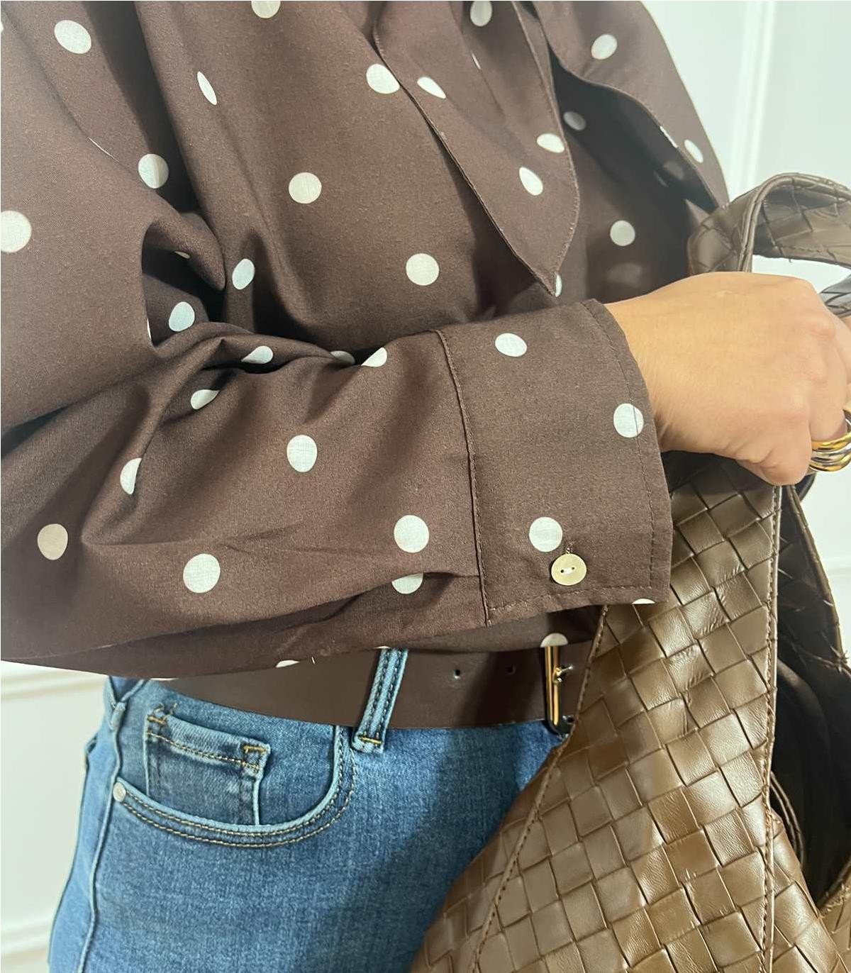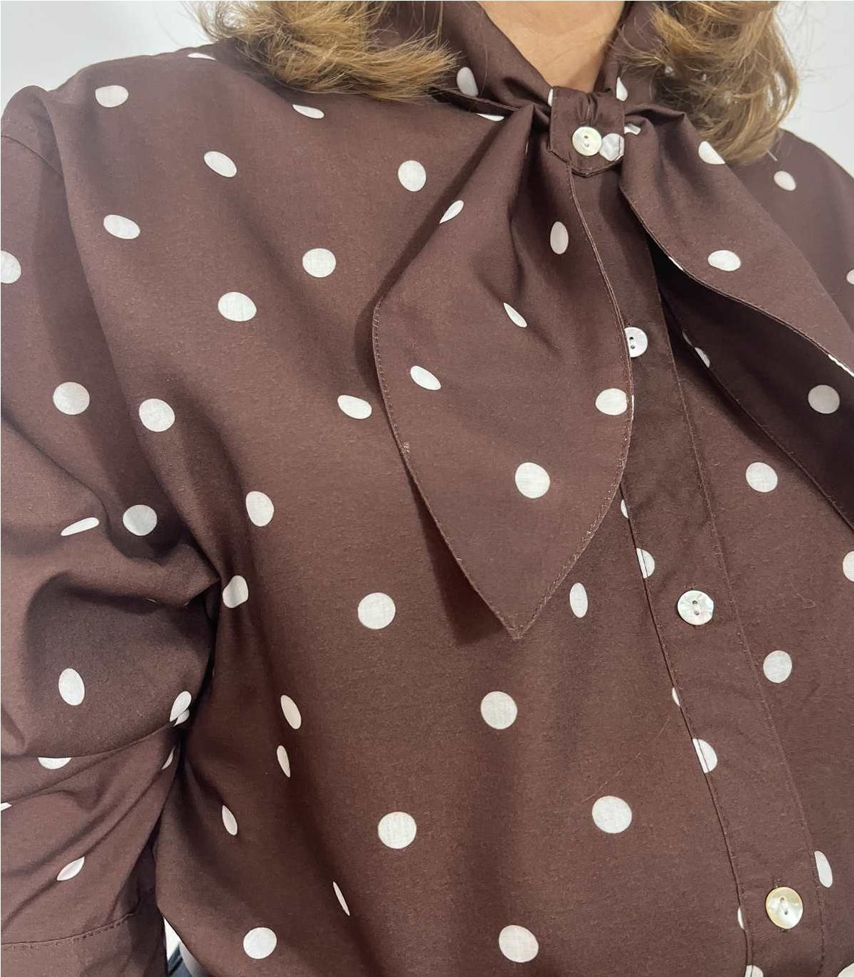 Camisa marron de topos , con lazo y puños abotonados, muy chic, se puede usar tanto en look mas sofisticados como en look mas casuales.