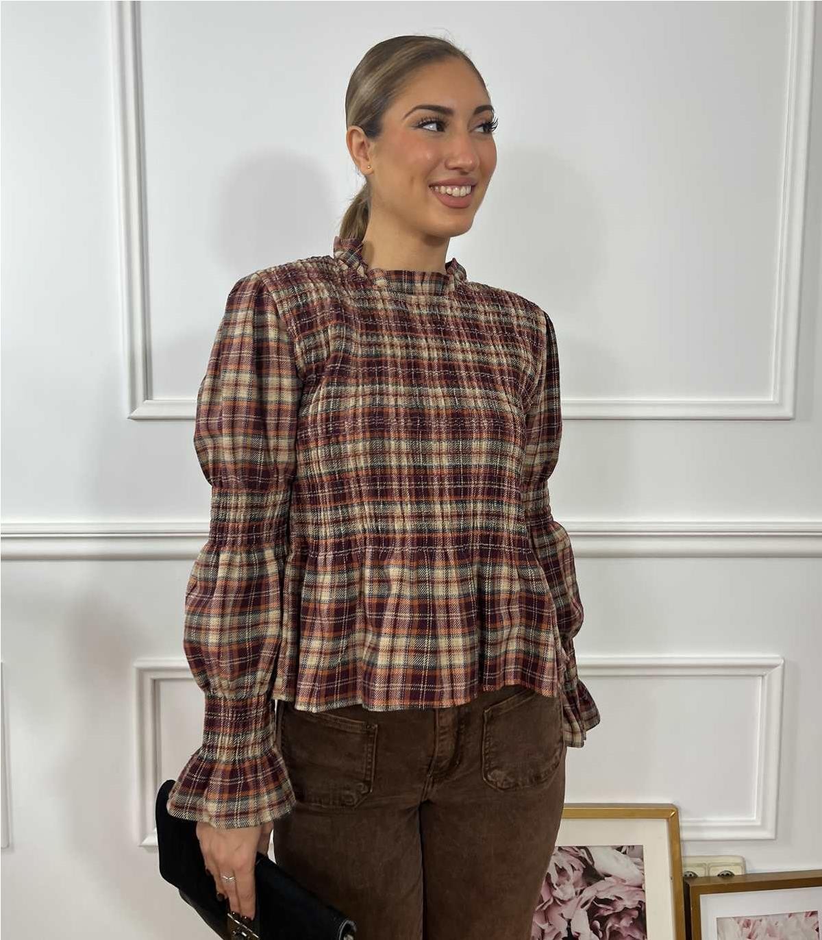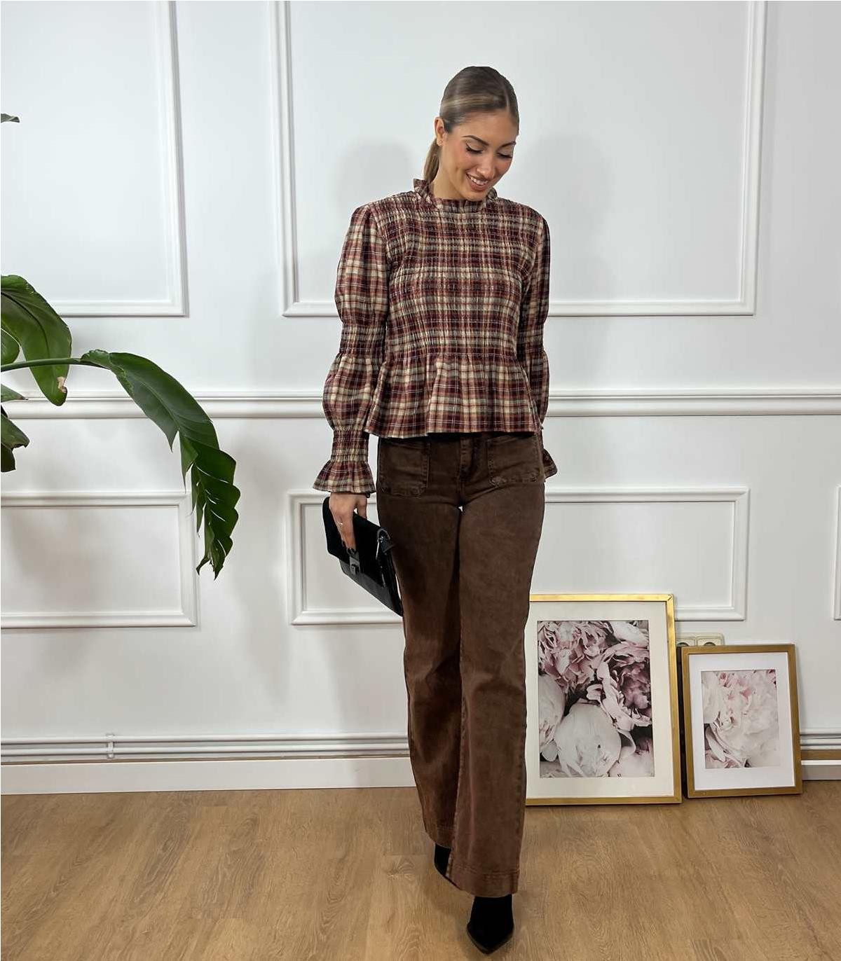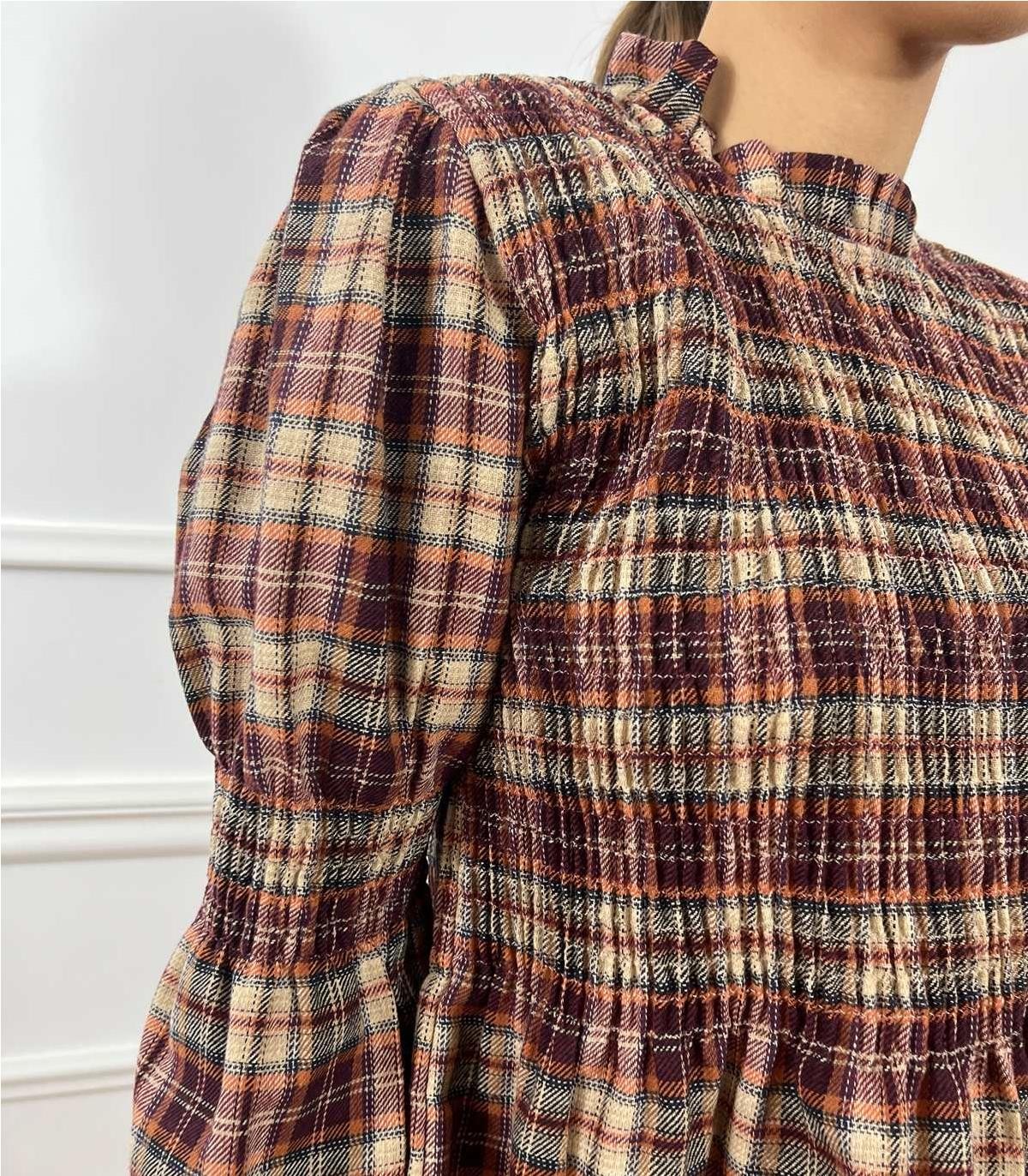 Blusa engomada en pecho, puños y cuello de volantes, tejido gordito, abierta por detras y con boton, abertura en puño de la manga. es ideal para tus look diarios.