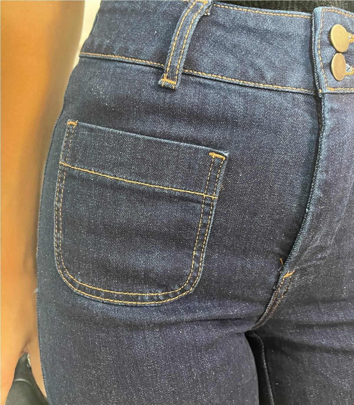 Jeans bolsillo cuadrado, alto abotonado con dos botones recto, bolsillos traseros cuadrados. Gisela lleva Talla S