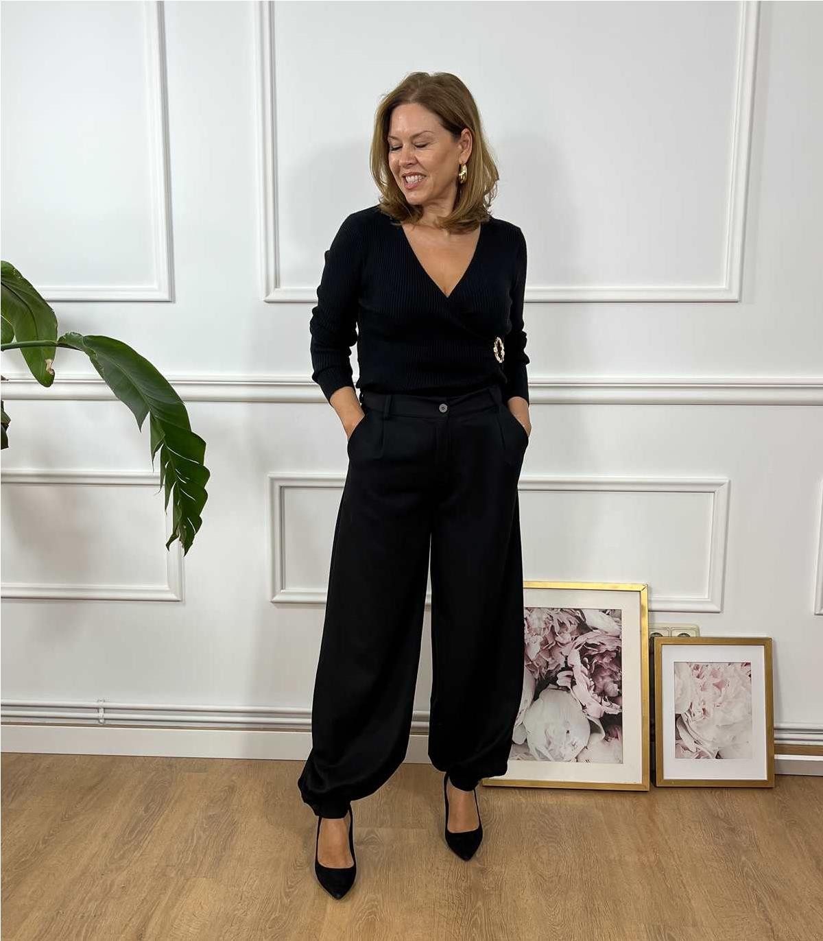 Bombacho con bolsillo frances, pinzas, botón en el bajo que le hace más chic, el tejido es gordito con caida, se adapta y no marca en la cadera, Perfecto para multitud de looks.